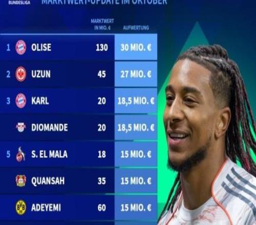 德转德甲身价涨幅榜:奥利塞暴涨3000万领跑,乌尊第二