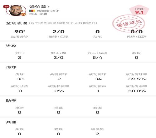 姆伯莫战布莱顿全场数据:梅开二度,传球成功率89.5%