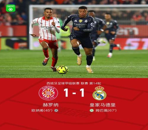 北京时间12月1日,西班牙足球甲级联赛第14轮,赫罗纳坐镇主场迎战皇家马德里。上半场,齐甘科夫助攻,欧纳希打破僵局。下半场,维尼修斯造点,姆巴佩主罚命中。全场比赛结束,皇马1-1战平赫罗纳,遭遇西甲联赛3连平,联赛的领头羊位置也被巴萨取代。