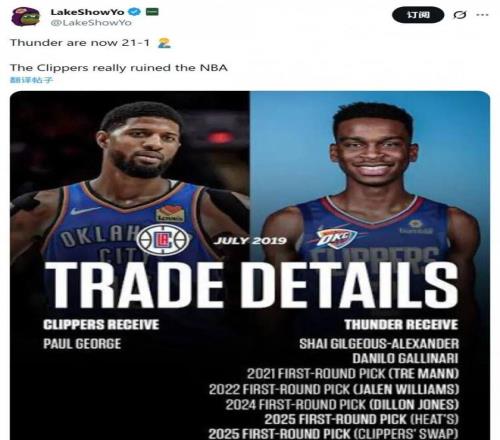 湖人自媒体LakeShowYo对此写道:“雷霆现在21胜1负,快船毁了联盟。”